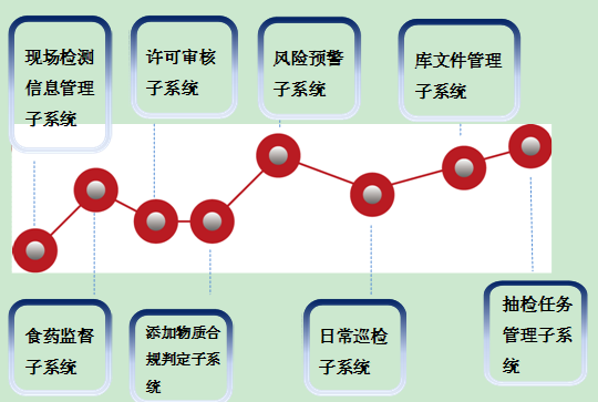 系統(tǒng)功能:現(xiàn)場檢測信息管理子系統(tǒng)、食藥監(jiān)督子系統(tǒng)、許可審核子系統(tǒng)、日常巡檢子系統(tǒng)、風(fēng)險預(yù)警子系統(tǒng)、添加物質(zhì)合規(guī)判定子系統(tǒng)、庫文件管理子系統(tǒng)、抽檢任務(wù)管理子系統(tǒng)等八大版塊內(nèi)容主體。