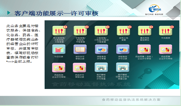 食藥移動監(jiān)督執(zhí)法系統(tǒng)是食品藥品監(jiān)督管理領(lǐng)域移動監(jiān)督執(zhí)法綜合服務(wù)系統(tǒng),主要用于食品藥品監(jiān)督管理部門移動監(jiān)管執(zhí)法使用。執(zhí)法人員可以手持客戶端現(xiàn)場檢測,錄像、錄音拍照等證據(jù)獲取,并依照法律法規(guī)對監(jiān)管對象進行動態(tài)出證、等級評審、許可審核和日常巡檢等業(yè)務(wù)工作處理,并上報處理結(jié)果數(shù)據(jù)。監(jiān)管人員根據(jù)執(zhí)法采集的數(shù)據(jù),及系統(tǒng)自動收集到的輿情信息,實現(xiàn)了食藥監(jiān)管部門對所轄區(qū)內(nèi)的食品安全問題重點監(jiān)管工作。