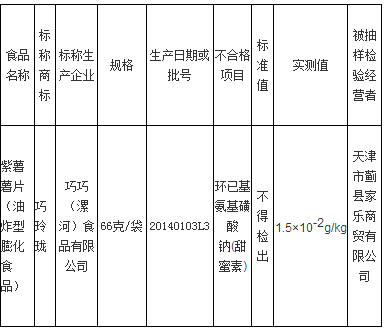 經(jīng)檢測,標(biāo)稱巧巧(漯河)食品有限公司生產(chǎn)的一個批次“巧玲瓏” 紫薯薯片(油炸型膨化食品)(66克/袋 20140103L3)環(huán)已基氨基磺酸鈉(甜蜜素)超標(biāo),標(biāo)準(zhǔn)要求不得檢出,實測值為“1.5×10-2g/kg”。