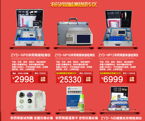3.農(nóng)藥殘留檢測(cè)產(chǎn)品降價(jià)大促銷(xiāo),如原價(jià)7800元的ZYD-NP6農(nóng)藥殘留檢測(cè)儀,現(xiàn)價(jià)2998元。ZYD-NP18農(nóng)藥殘留快速檢測(cè)儀,原價(jià)29800元,現(xiàn)價(jià)25330元,活動(dòng)期間購(gòu)買(mǎi)再減5000元。還有適合各大品牌農(nóng)殘儀使用的農(nóng)藥殘留速測(cè)卡,原價(jià)30元,現(xiàn)價(jià)18元。