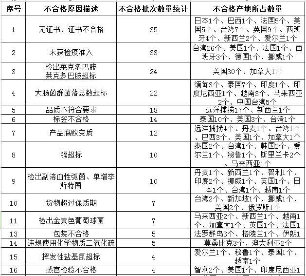 證書不合格、未獲檢疫準入、檢出萊克多巴胺和菌落總數超標為不合格主要原因。以上不合格產品均已依法做退貨、銷毀或改作他用處理,且未在國內市場銷售。