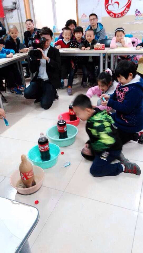 小朋友們?cè)诳蓸?lè)中放入了幾顆神秘物體,只見(jiàn)樂(lè)可瞬間噴射出來(lái),小朋友和家長(zhǎng)的驚呆了。
