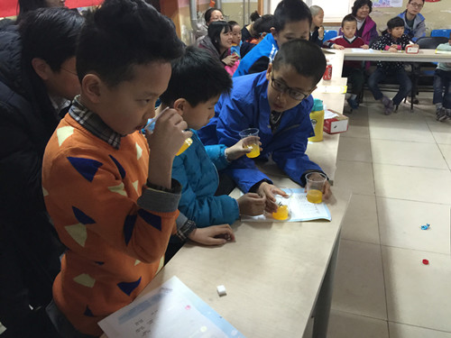 老師將事先調(diào)配好的果汁和從市場(chǎng)購(gòu)買(mǎi)的果汁讓家長(zhǎng)和小朋友們用感官來(lái)鑒別,猜錯(cuò)的還真不少。