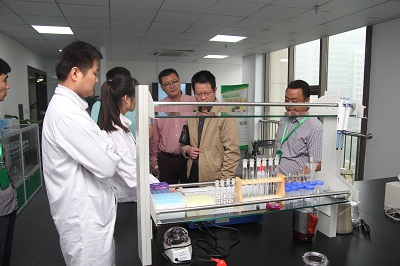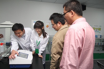 成立儀式結束后,技術人員對參觀人員進行現(xiàn)場檢測實驗演示,分別利用農藥殘留速測卡和農藥殘留速測儀快速檢測果蔬中的農藥殘留,讓參觀人員了解快速檢測技術的優(yōu)勢。