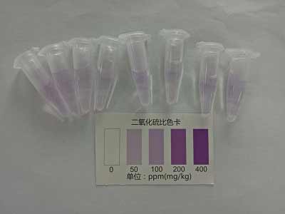二氧化硫:在1.5ml離心管中先滴加2滴檢測(cè)液A,1滴檢測(cè)液B,上下?lián)u動(dòng),混勻;然后加入1ml樣品液,立即蓋塞混勻。放置5分鐘觀察顏色變化,并與色卡對(duì)照,得出樣品中二氧化硫或亞硫酸鹽是否超標(biāo)的信息。