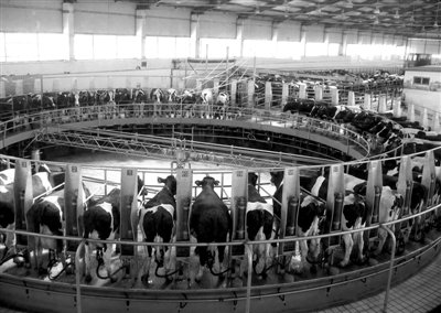 2010年12月10日,奶牛在內(nèi)蒙古蒙牛集團(tuán)轉(zhuǎn)盤式自動擠奶生產(chǎn)線上等待擠奶。