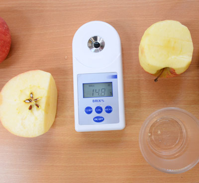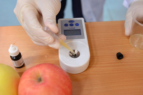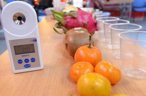北京智云達(dá)技術(shù)工程師楊老師和王老師首先將水果去皮榨汁,不加水,再通過使用北京智云達(dá)自主研發(fā)生產(chǎn)的快速檢測(cè)產(chǎn)品:數(shù)顯糖度儀,對(duì)樣品溶液的糖度進(jìn)行檢測(cè)。