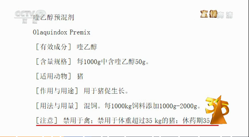喹乙醇:一種黃色粉末,動物長期食用,會蓄積在動物體內,誘變細胞染色體畸形。此外還會造成耐藥性,給人類身體健康帶來潛在危害。因此,我國2005年版《獸藥典》以及《飼料藥物添加劑使用規范》都明確規定,喹乙醇適用范圍:35公斤以下的豬,禁用于禽、禁用于體重超過35kg的豬、休藥期35天。