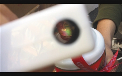 2月25日,記者拆開張建的假茅臺酒檢測真偽,結果顯示瓶蓋處有彩條(根據說明書提示,此為正品包裝的特征,但記者所檢測的茅臺酒實際為假茅臺酒)。
