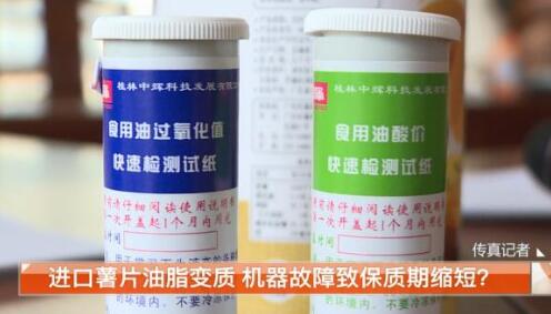 記者找到了專業(yè)的檢測人員,對薯片里的油進行酸價和過氧化值的檢測。經檢測,這款薯片里油脂的酸價和過氧化值均超過了正常范圍,證明薯片使用的植物油已經酸敗。