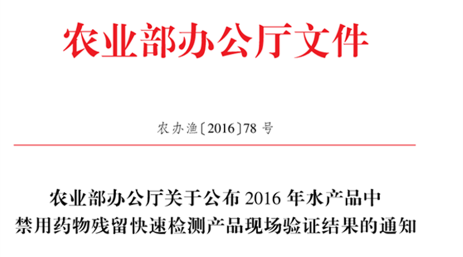按照《農業部辦公廳關于開展2016年度水產品中禁用藥物快速檢測產品推薦篩選和驗證工作的通知》(農辦漁〔2016〕57號)要求,農業部辦公廳組織開展了2016年水產品中禁用藥物殘留快速檢測產品推薦和初審工作,并對15家企業生產的77種水產品禁用藥物的快檢產品進行了現場驗證。北京智云達參加了呋喃唑酮等呋喃四項代謝物的檢測卡驗證。