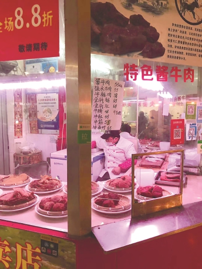 順著男店員的指點,屠先生看到擺在桌上的醬牛肉和鹽水牛肉,的確品相都很不錯,屠先生選擇了鹽水牛肉。隨后,男店員揀出一塊適合屠先生大小要求的鹽水牛肉,放進該店提供的盒里,將牛肉和盒子一起稱重:“鹽水牛肉58元一斤,你選的這塊一共是28.4元,夠嗎?”“夠了,就中午吃一頓。”屠先生說。