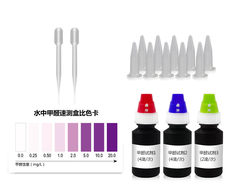 1. 取1.0mL水樣加入到1.5mL離心管中,加入4滴甲醛試劑1,再加入4滴甲醛試劑2,蓋蓋后混勻,1分鐘后,加2滴甲醛試劑3,搖勻,5~10分鐘內,與比色卡對比得到水中甲醛含量。