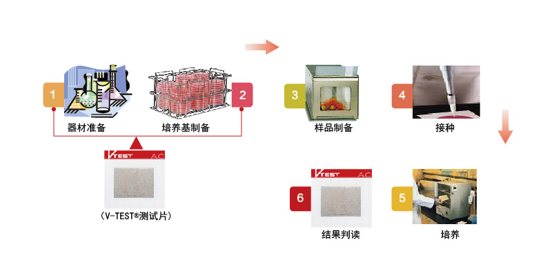 V-TEST指標菌快速檢測試紙片為預制型培養基系統,它含有標準方法的培養基,冷凝膠和指示劑,適用于食品、飲用水及原料中的指標菌的測定,也可以用于食品加工環境中的指標菌的測定。