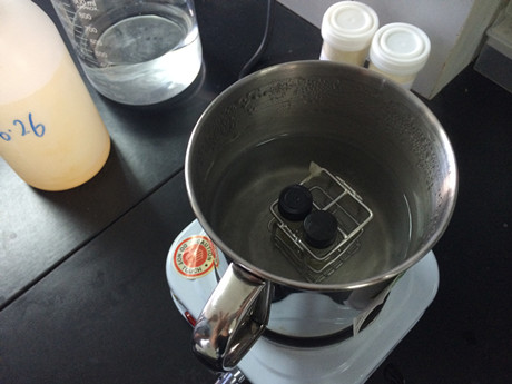 2、加3ml地溝油試劑1,用力振搖30秒,沸水浴10分鐘,涼水冷卻3分鐘