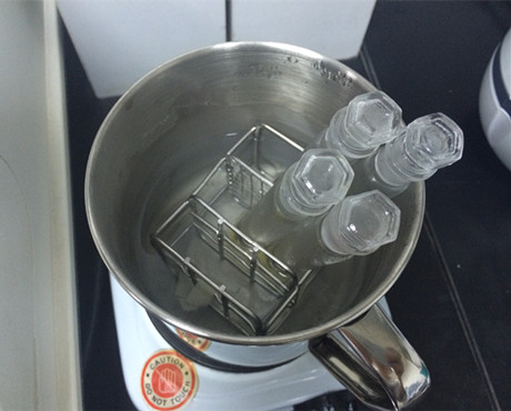 3、樣品管:吸取2mL樣品處理液于10mL比色管中,加入2mL山梨酸試劑一,加上蓋子,搖勻,于沸水浴中加熱7分鐘,立即加入2mL山梨酸試劑二,搖勻,繼續沸水浴加熱10分鐘,取出涼水冷卻3分鐘。