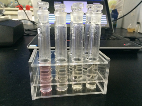 3、樣品管:取制備好的樣品液加入A溶液1mL,搖勻,加入三氯甲烷4mL,蓋上塞子,較為快速顛倒20次,靜置5min,取下層溶液進行檢測。