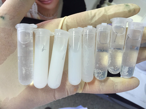 首先針對這八種樣品進(jìn)行分別前處理,面膜類的直接擠壓,吸取擠壓得到水樣1ml轉(zhuǎn)移到5ml離心管中;粉餅加入3ml有機(jī)溶劑到粉餅中,再擠壓粉餅得到1ml樣本液轉(zhuǎn)移到5ml離心管中;乳狀或者膏狀樣品直接稱量1g轉(zhuǎn)移到有機(jī)溶劑中進(jìn)行溶解,對溶解液進(jìn)行過濾,轉(zhuǎn)移1ml濾液到5ml離心管中。