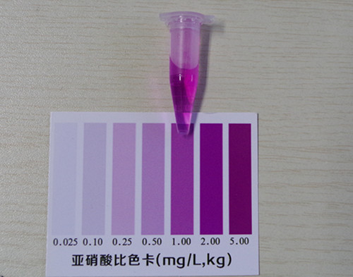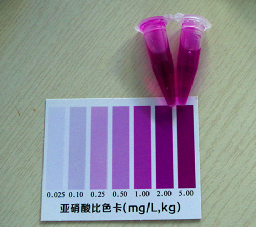 加入2滴試劑2搖勻靜置10分鐘后與標(biāo)準(zhǔn)比色卡對比,該比色卡上的數(shù)值乘上10即為樣品中亞硝酸鹽的含量mg/kg(以NaNO2計(jì))。
