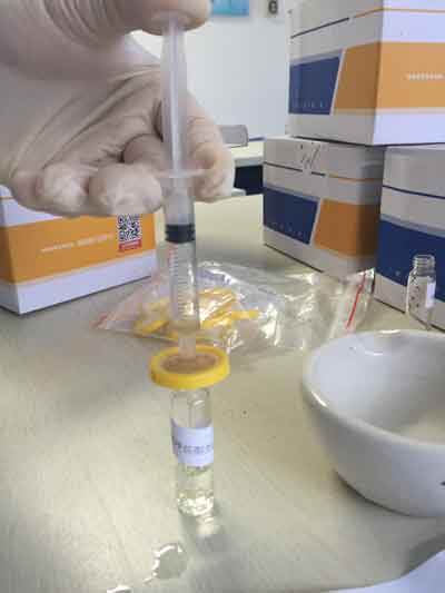 拔下注射器活塞(及針頭),接上過(guò)濾器,將A瓶上清液倒入針筒內(nèi),裝入活塞擠壓,收集全部濾液于試劑B瓶中。